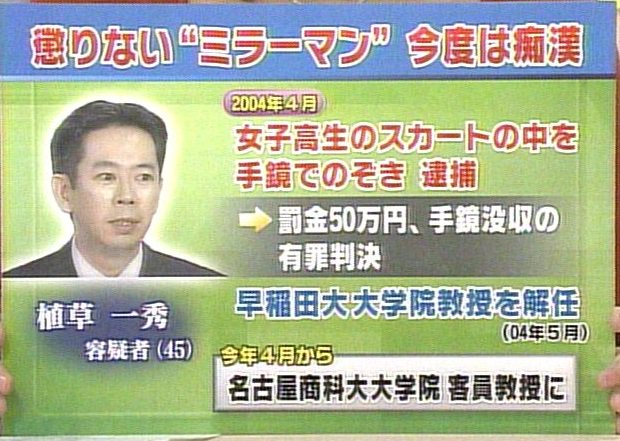 経済評論家でテレビ出演もする植草一秀は、早稲田大学大学院教授の職にありながら、覗きや痴漢といった迷惑防止条例違反で逮捕されています。 2004年4月8日、品川駅のエスカレーターで手鏡を利用して女子高生のスカートの中を覗こうとしたとして、鉄道警察隊員により東京都迷惑防止条例違反の容疑で現行犯逮捕されました。エコノミストとしてテレビ出演するなど、硬いイメージの強い植草氏の逮捕は多くの人に衝撃を与えました。
